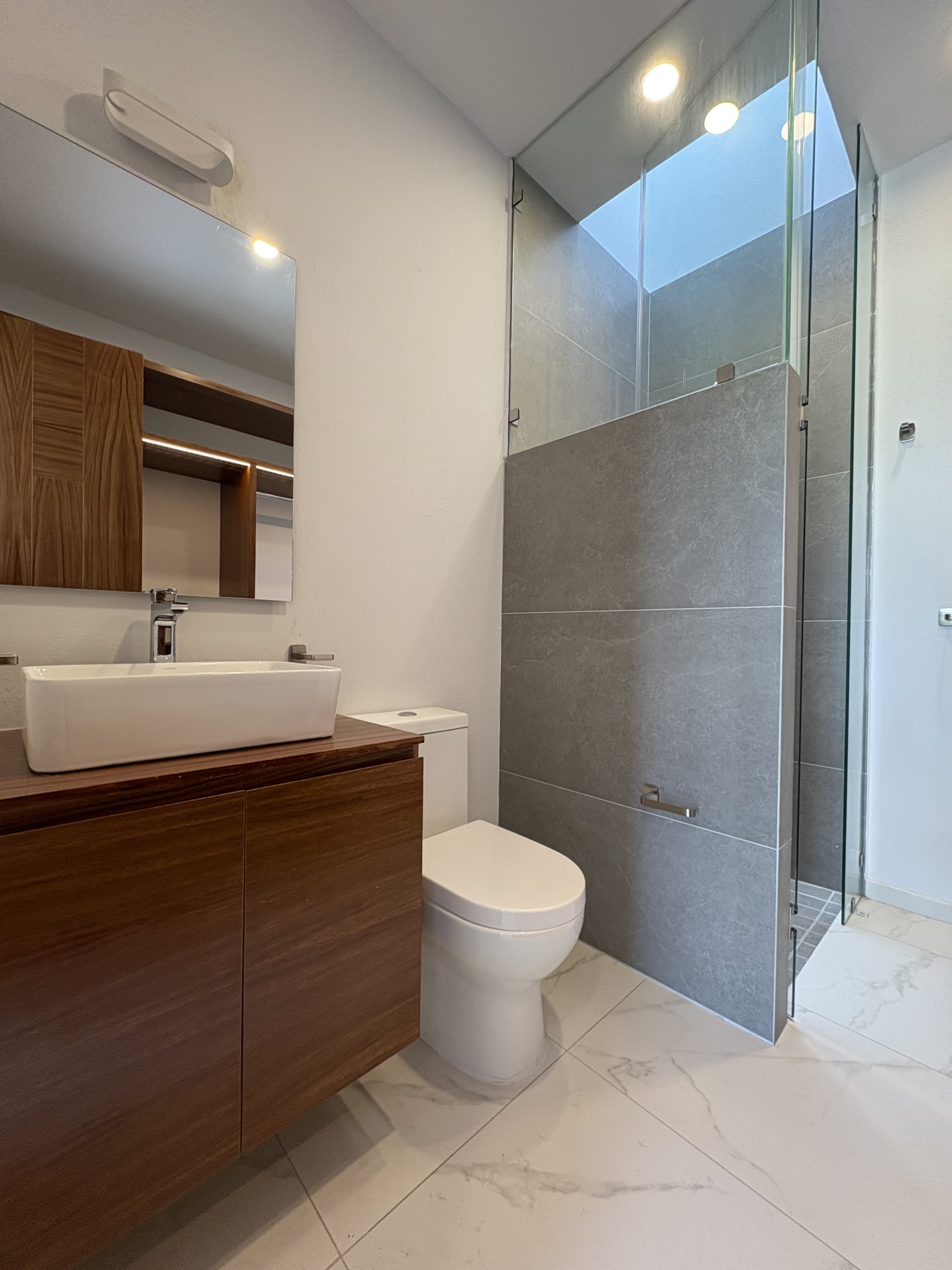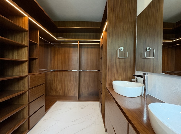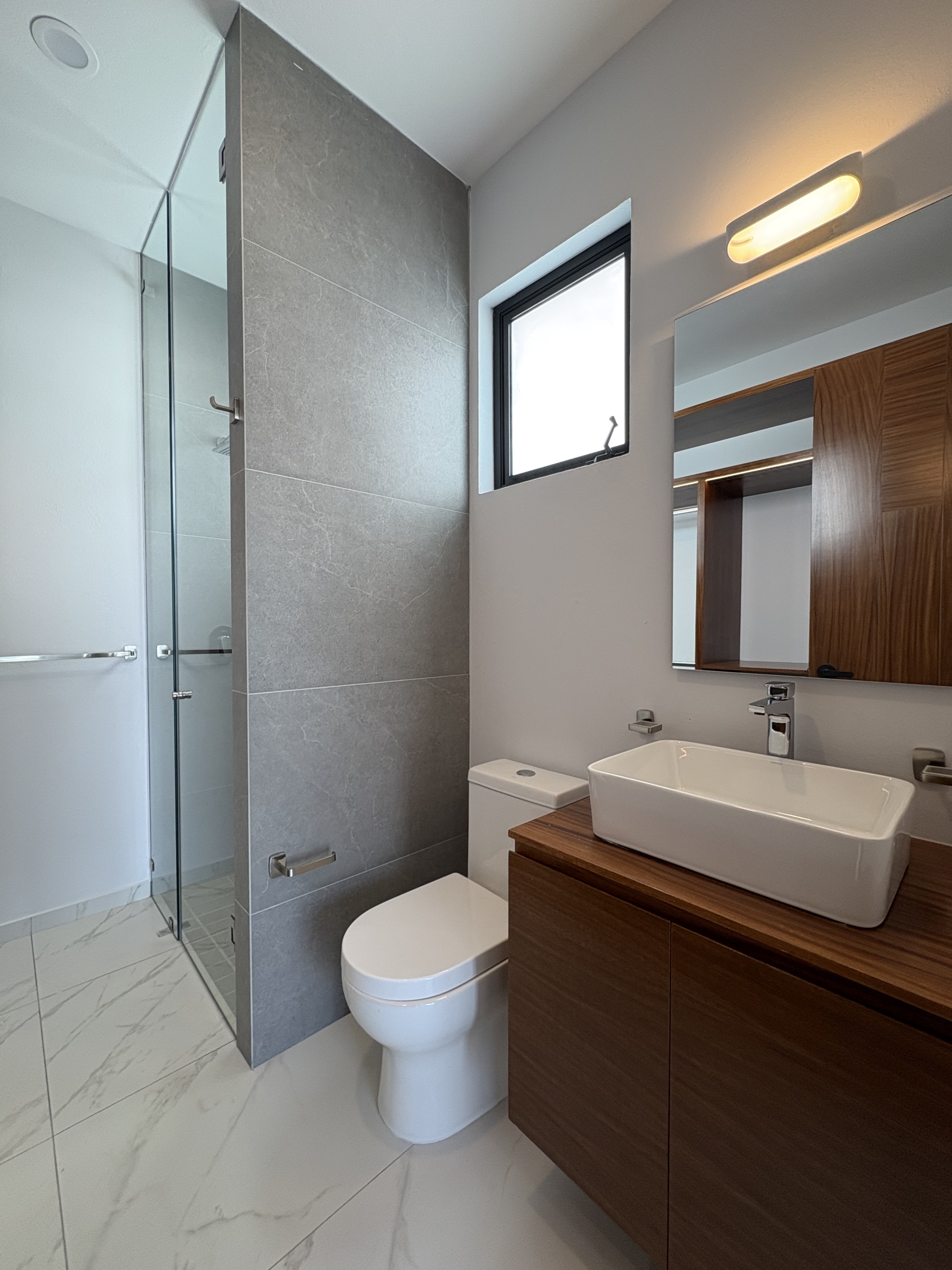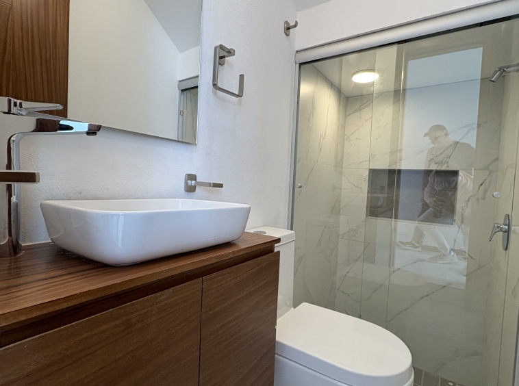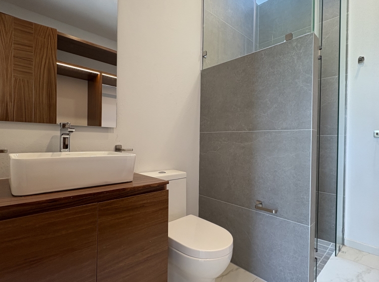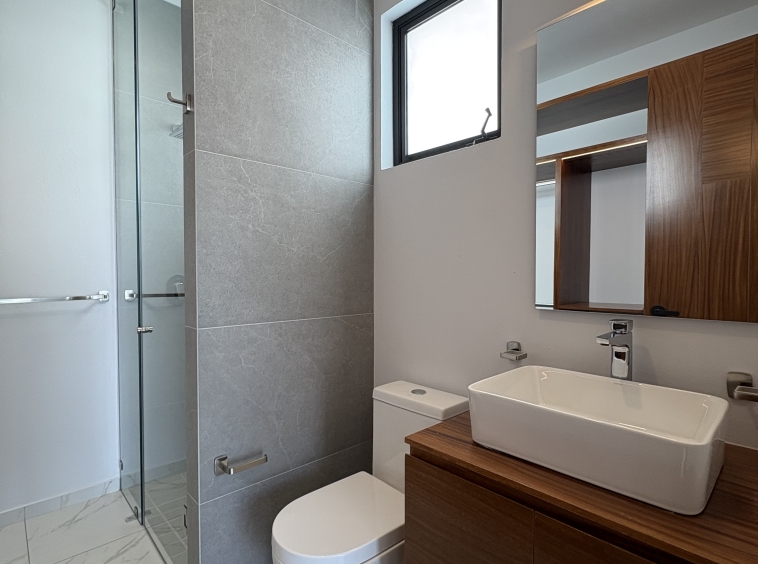 Dos recámaras secundarias, cada una con su baño completo y clóset. La recámara principal destaca por su amplitud, balcón con vista directa al parque, vestidor y baño completo.