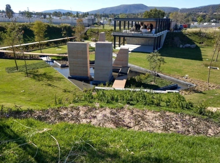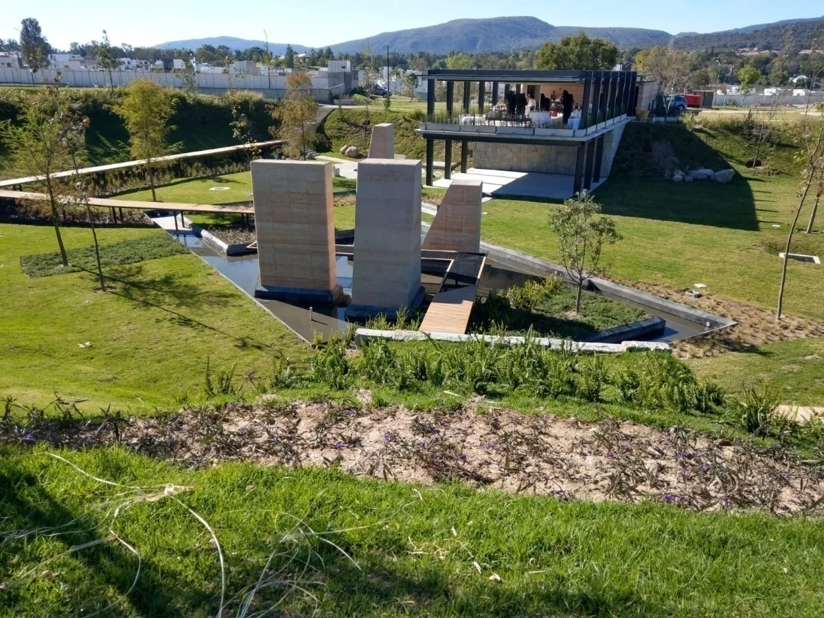 Cisterna de 5,000 L, tinaco de 1,100 L, sistema hidroneumático y riego por aspersión.