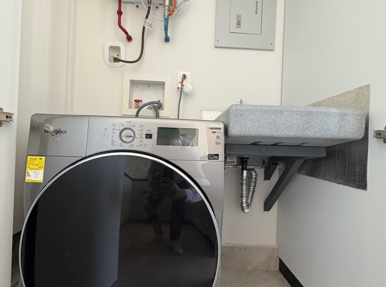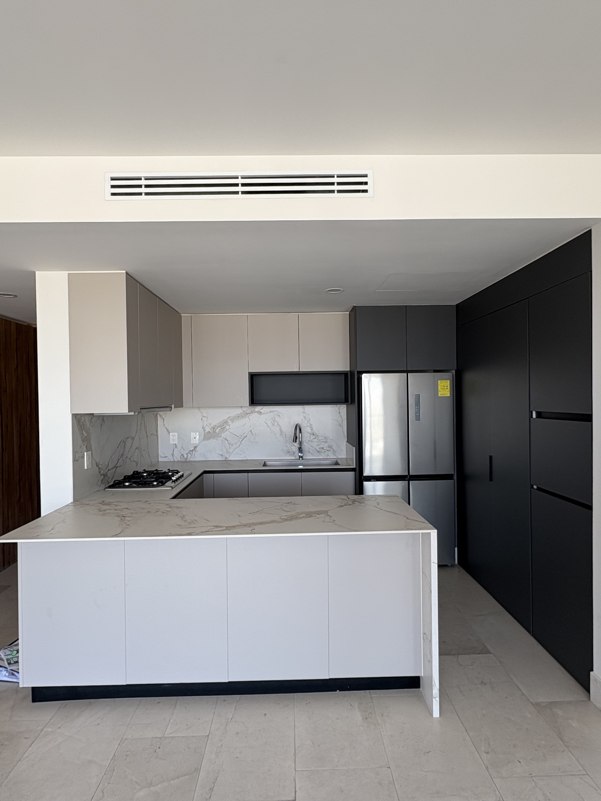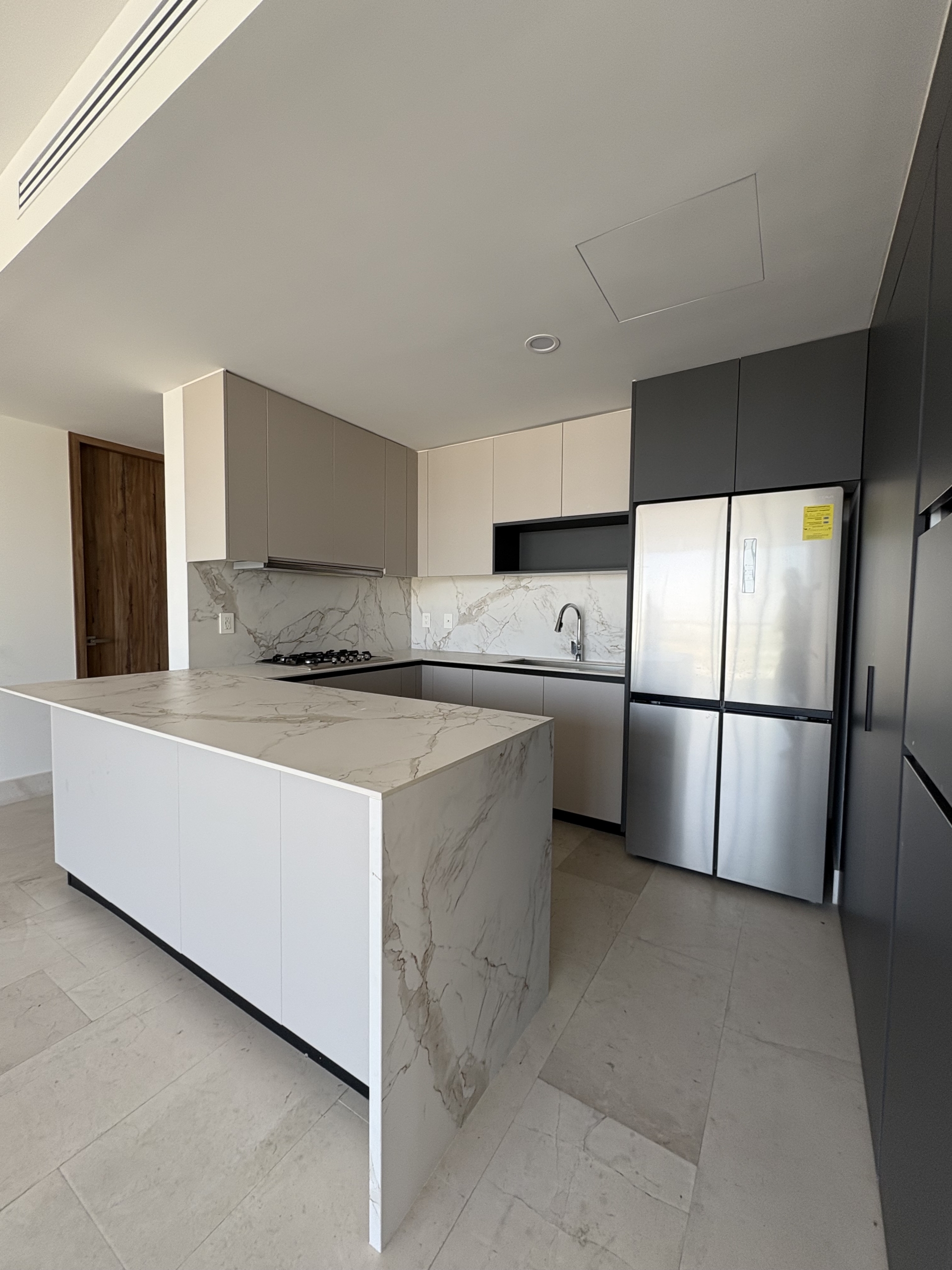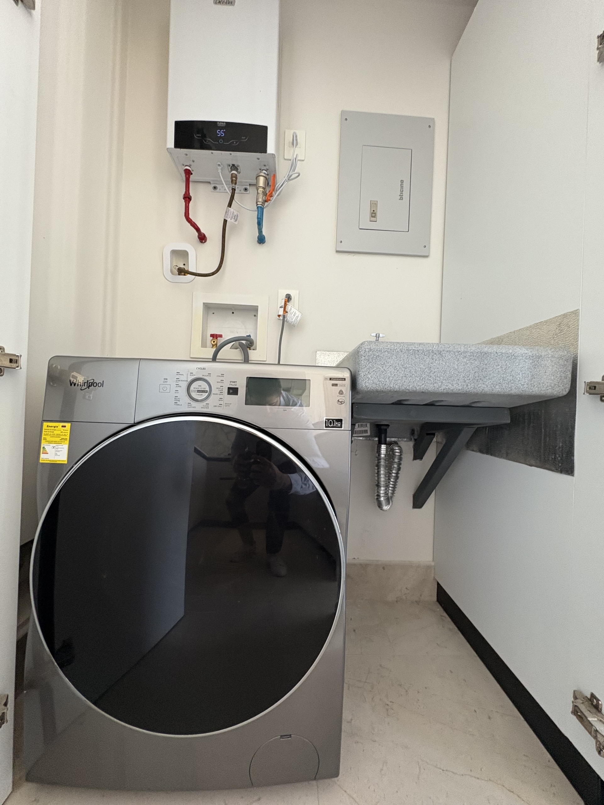 – Cocina integral amplia equipada con electrodomésticos modernos: lavasecadora, refrigerador y microondas.